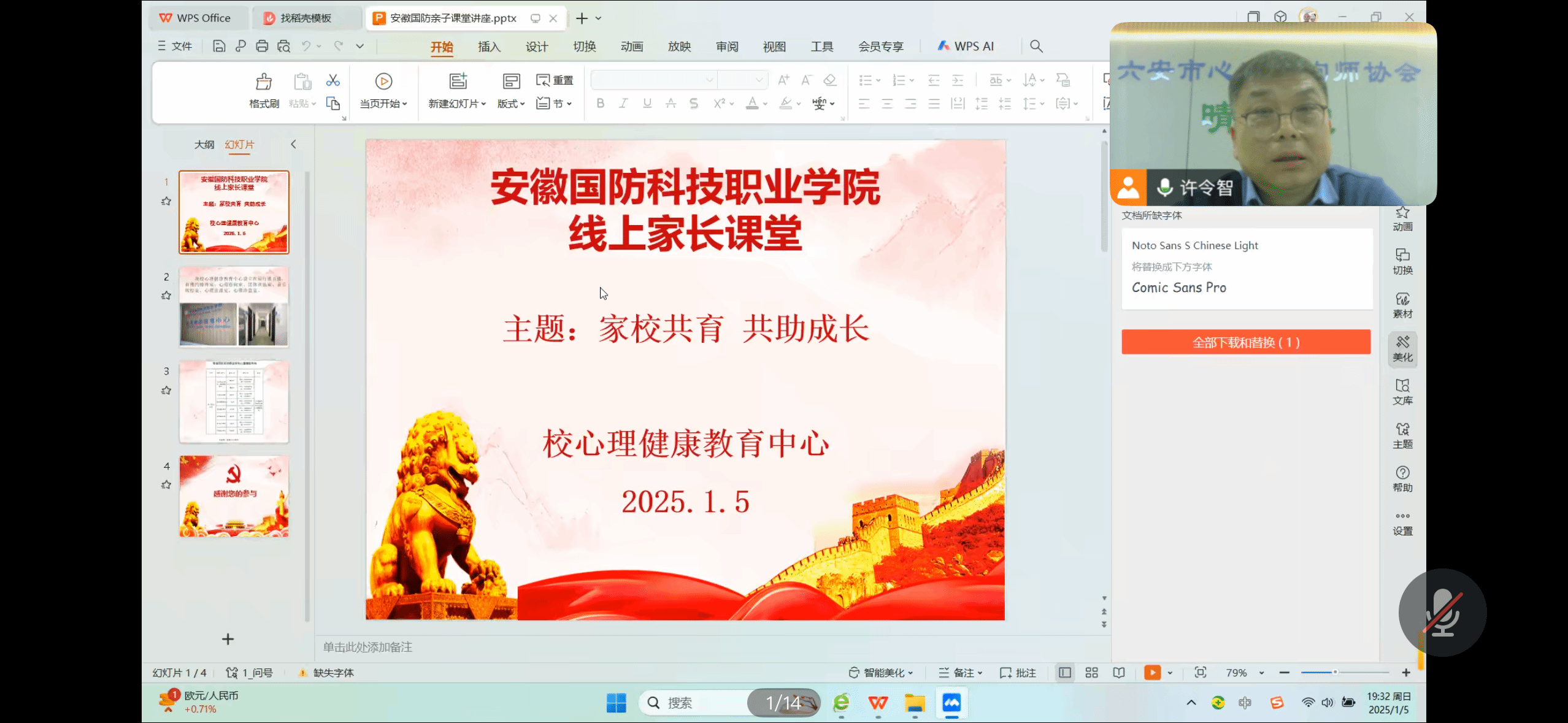 本网讯(学生处 费思佳)为了深入开展家校联动,发挥家庭育人重要作用,提升学生心理健康教育合力,2025年1月5日晚上,学生处心理健康教育中心组织了线上家庭课堂。讲座邀请了六安市心理咨询师协会会长许令智主讲。心理健康教育中心主任戴柳主持了会议,各二级学院家长代表、心理健康专职老师参与了此次讲座。
