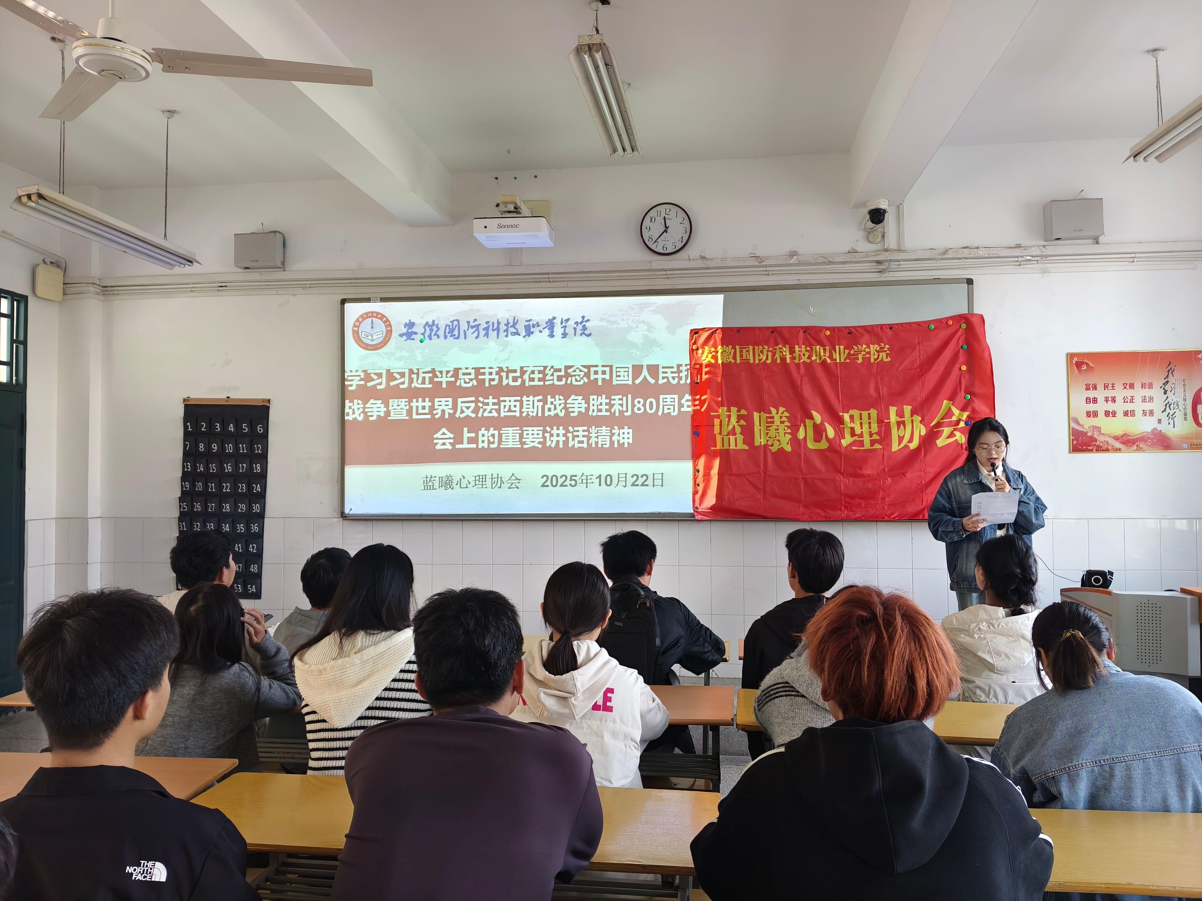 随后,胡玉婷同学带领大家学习了《习近平总书记在纪念中国人民抗日战争暨世界反法西斯战争胜利80周年大会上的重要讲话精神》。