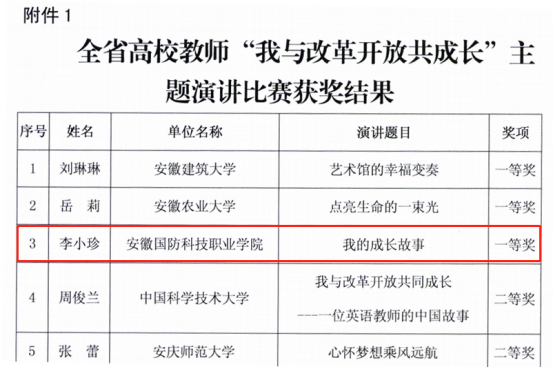2018年12月5日下午,安徽省高校教师“我与改革开放共成长”主题演讲比赛决赛在安徽建筑大学举行。近日,中共安徽省委教育工委、安徽省高等学校思想政治教育研究会印发了《关于公布全省高校教师“我与改革开放共成长”主题演讲比赛结果的通知》(皖教工委函[2018]519号),万象城官网李小珍老师与安徽建筑大学刘琳琳老师、安徽农业大学岳莉老师荣获比赛一等奖。