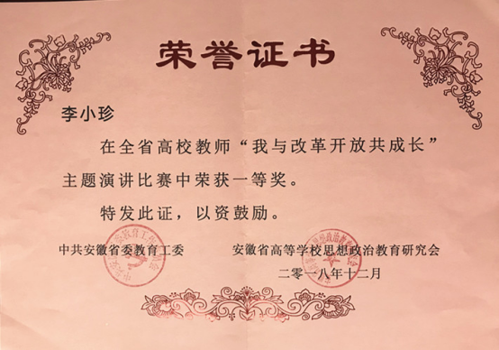 本次比赛由中共安徽省委教育工委、安徽省高等学校思想政治教育研究会主办、安徽省演讲协会高校教师联合会协办、安徽建筑大学承办。比赛要求选手结合庆祝改革开放40周年,全面回顾和展现40年来改革开放的巨大成就,进一步激发全省高校教育工作者忠诚党的教育事业,争做“四有”好老师。比赛设置一等奖3名,二等奖6名,三等奖9名,优秀奖12名。参经过层层选拔,30位选手从来自全省各高校的121名参赛者中脱颖而出,进入决赛。万象城官网李小珍老师以与安徽农业大学岳莉老师并列第二名的成绩获得比赛一等奖。