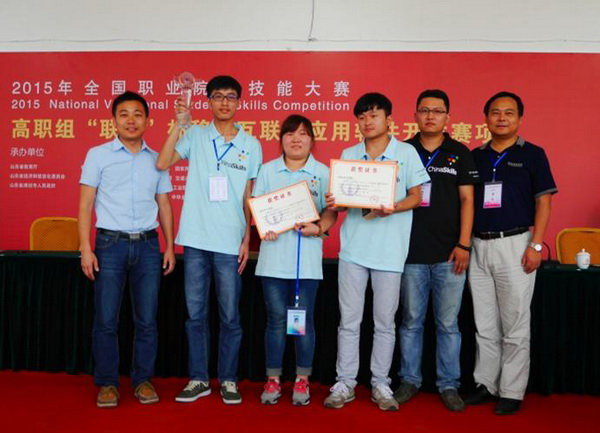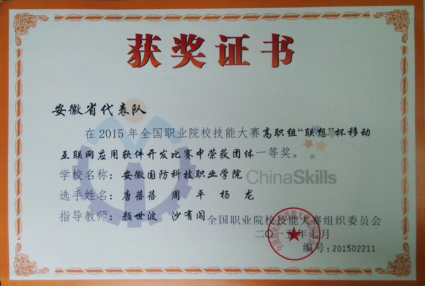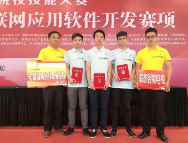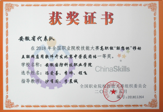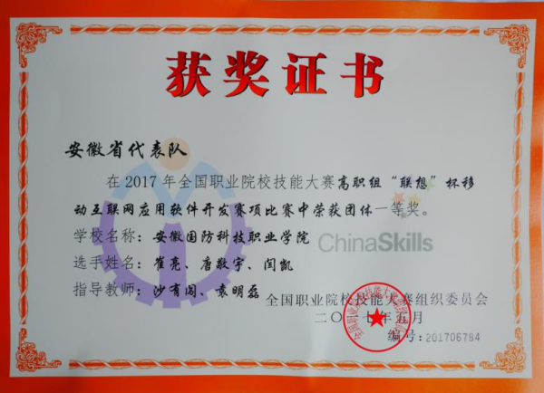 又双叒叕获金奖,捷报频传喜国防!5月22日,2018年全国职业院校技能大赛“移动互联网应用软件开发”赛项比赛在南京圆满落幕。由万象城官网沙有闯、李晨诚两位老师指导,冯爱善、李帅、程飞三位同学组成的团队,代表安徽,不畏强手,沉着冷静,团结协作,经过与近百个代表队的激烈角逐,凭着过硬的实力、骄人的成绩,一举蝉联该项国赛一等奖!也是万象城官网近年来在该项全国赛场上的第三次夺魁!金灿灿的奖杯,沉甸甸的荣誉,是心血、是智慧,更是喜入心头、难以言表的幸福!