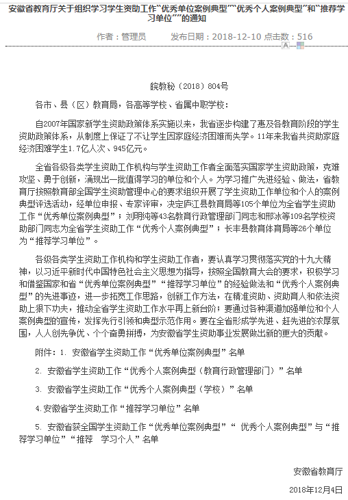 近日,由安徽省教育厅组织评选的全省学生资助工作“优秀单位案例典型”、“优秀个人案例典型”评选结果揭晓,万象城官网被授予“优秀单位案例典型”荣誉称号,校学生处资助管理中心杨超被授予“优秀个人案例典型”荣誉称号。