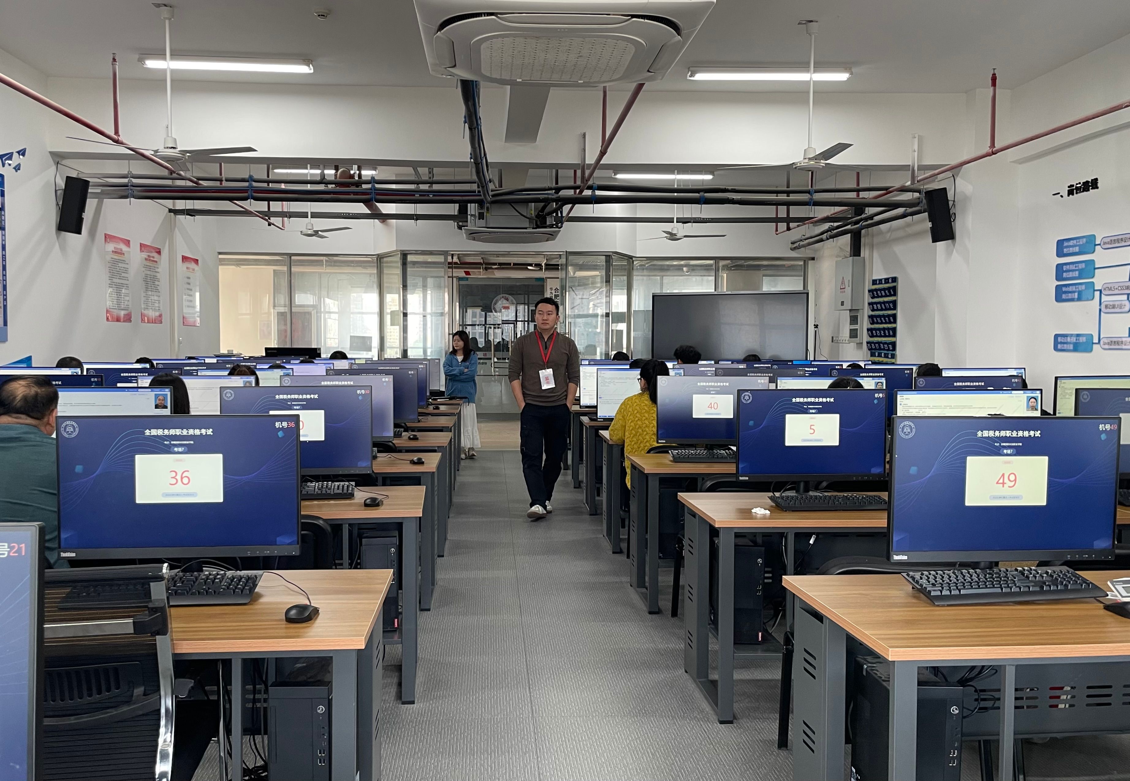 税务师职业资格考试是我国财税领域极具权威性的职业资格考试,对规范税务专业服务行为、提升税务从业人员专业素养具有重要意义。承接此类高规格考试,既是对学院办学条件和组织能力的充分肯定,也是学院履行社会服务职能的生动实践。为保障考试工作万无一失,信息技术学院实训中心自接到考点任务后,严格对标税务师考试标准化要求,对11个考场的软硬件设施进行全面升级与调试,确保监控系统、身份核验设备、网络环境等均达到考试规范。同时,细化考务流程,将考场布置、技术支持、考场监考、考生引导、后勤保障等工作分解至具体责任人,提前开展业务培训,为考生提供专业且温馨的全方位服务。