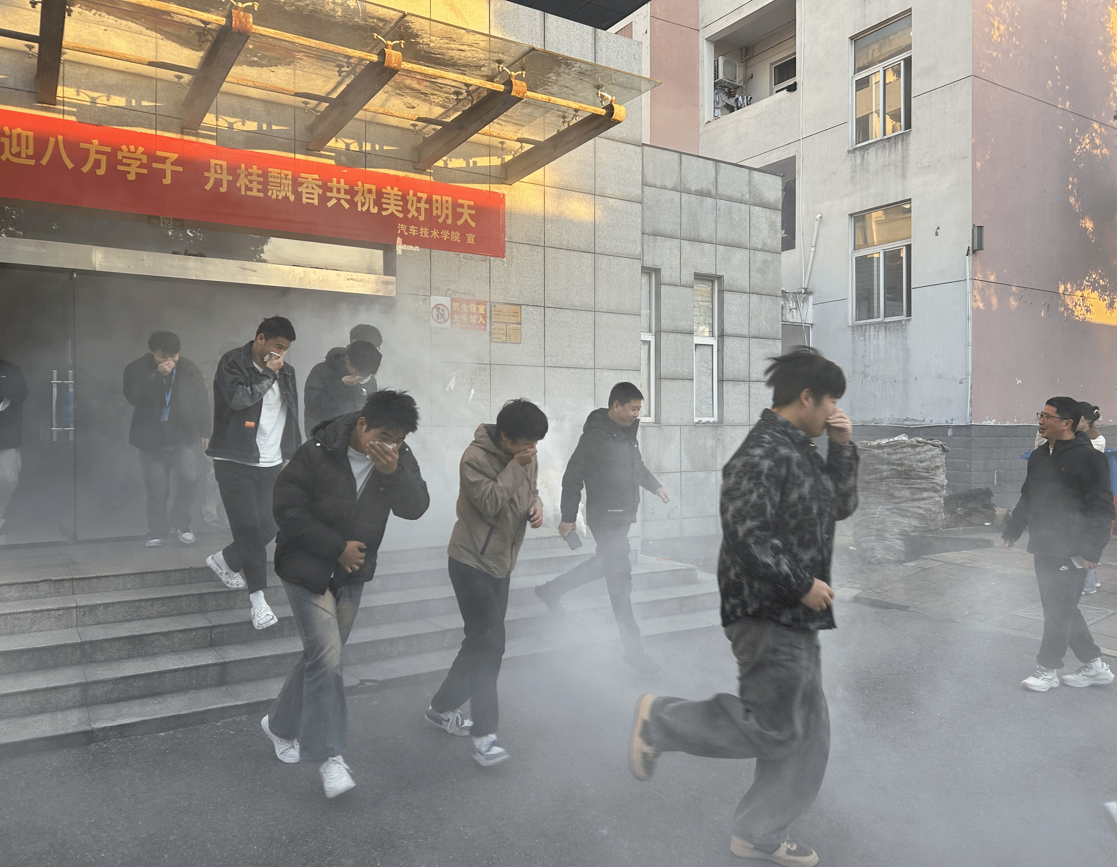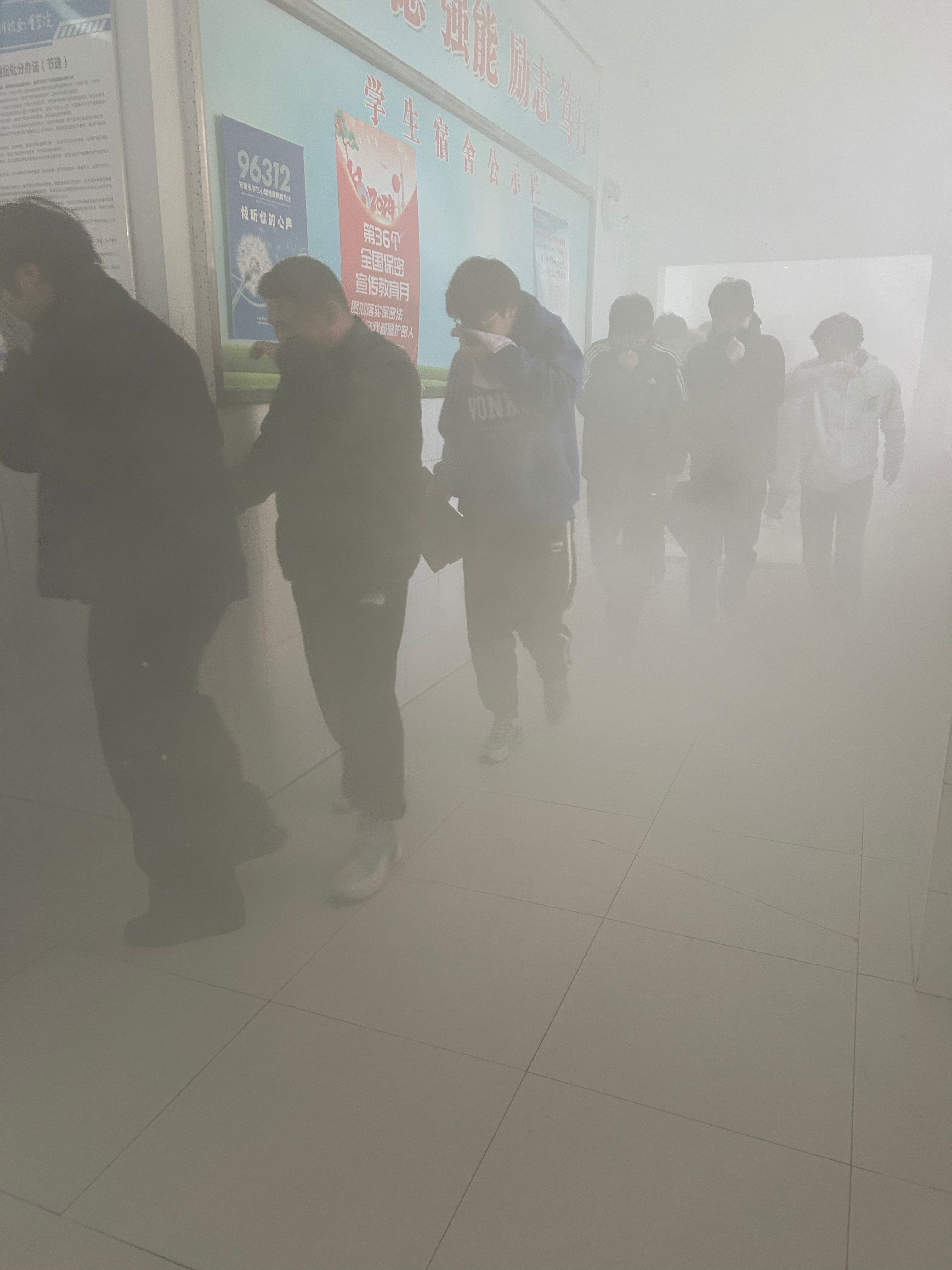 下午4点40分,随着消防警报声骤然响起,演练正式启动。学生社区管理员迅速启动应急预案,发出紧急疏散指令。同学们立即放下手中物品,关闭宿舍电源,取出湿毛巾捂住口鼻,在寝室长的带领下,按照预设的疏散路线有序撤离。各楼层安全出口、楼梯转角处,辅导员与学生宿舍网格员组成的“引导员”全程值守,提醒学生保持秩序、避免拥挤推搡。整个撤离过程中,同学们表现出良好的组织性和纪律性,无吵闹、滞留等情况,所有学生均安全抵达指定的安全集合点。