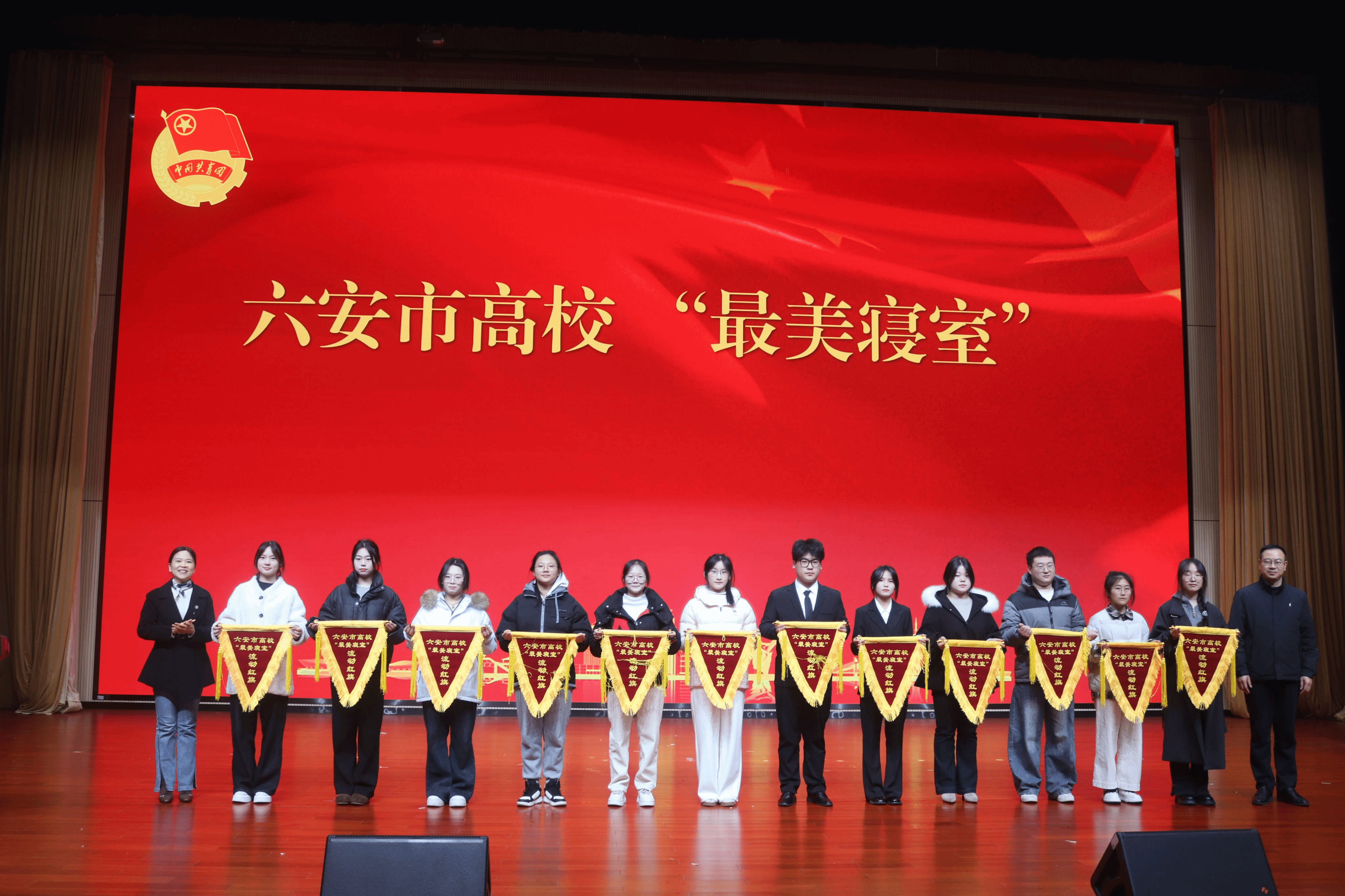 本网讯(信息技术学院 赵德志)近日,由团六安市委、六安市学生联合会主办的“活力社团 青春飞扬”高校社团风采展示活动圆满落幕。活动现场高校“最美寝室”颁奖环节,全市12名“最美寝室”代表依次登台领取流动红旗,我院10栋515寝室作为获奖代表登台,成功斩获这项市级荣誉,展现了我院学子优良的精神风貌与学院寝室文化建设的丰硕成果。