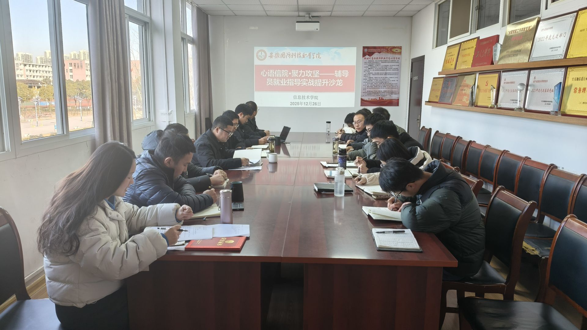 本网讯(信息技术学院 马士君)为精准破解学生就业工作痛点堵点,全面提升辅导员就业指导实战能力,12月26日下午,“心语信院”辅导员工作室在知行楼304会议室成功举办首期“心语信院・聚力攻坚——辅导员就业指导实战提升沙龙”。全体专兼职辅导员齐聚一堂,以案例分享为依托,以问题研讨为核心,共同探索就业指导工作的有效路径。学院党总支书记王胜、副书记杜洪宇出席活动,沙龙由工作室负责人马士君主持。