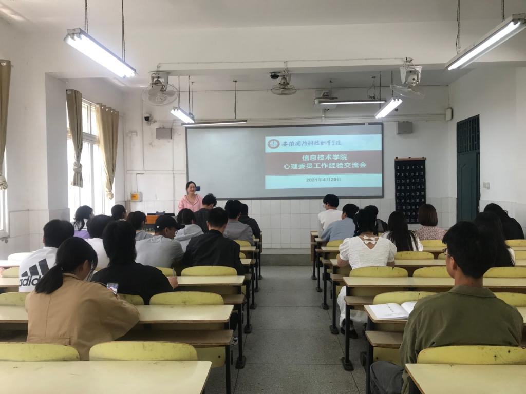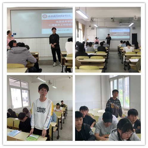 本网讯(信息技术学院 马士君)为促进心理委员间的交流与学习,进一步发挥优秀心理委员的榜样带头作用,帮助各班级心理委员更好的开展班级心理健康工作,4月29日中午11:40,信息技术学院在教二楼104教室召开了心理委员工作经验交流会。19级、20级共28个班级的心理委员参加了会议,会议由学院心理辅导员马士君老师主持。