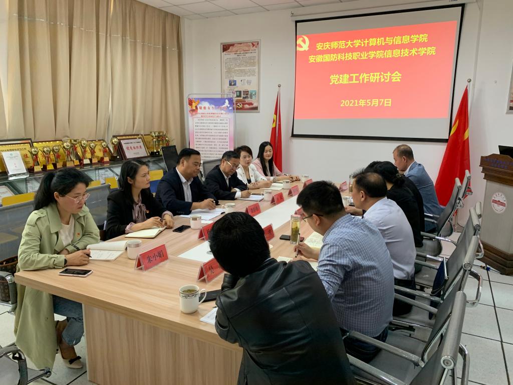 本网讯(信息技术学院 马士君)5月7日,校党委委员、信息技术学院院长黄存东带队,一行6人赴安庆师范大学计算机与信息学院进行全国党建工作样板支部建设考察学习。安庆师范大学计算机与信息学院党总支书记陈银凤、院长王一宾、党支部副书记李培森等6人参加座谈交流。会议由陈银凤主持。