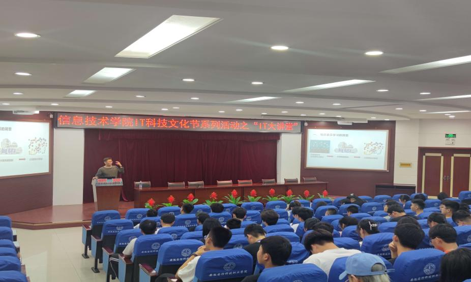 IT大讲堂——算法和我们的生活。主讲人沙有闯是信息技术学院副院长,曾获安徽省模范教师、安徽省五一劳动奖章、安徽省职工职业道德建设标兵个人、安徽省教坛新秀。沙院长从算法与我们的生活的定义、特征及目前的发展机遇和问题着手,分析计算机的发展状况和优势,结合计算机的产品体系和行业解决方案,为同学们展现计算机业务在各个行业的具体应用。