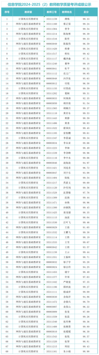 根据《万象城体育awcsport教师教学质量考核评价办法(修订)》、《万象城体育awcsport《教师教学质量考核评价办法(修订)》的补充规定》(校教〔2025〕4号),信息技术学院2024-2025学年第二学期教学质量考评工作已经完成,现将考评成绩公示如下。