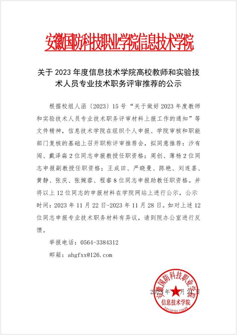 信息技术学院2023年度教师和实验技术人员专业技术职务评审推荐公示
