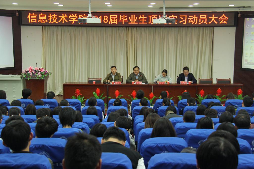 为切实做好2018届毕业生的顶岗实习工作,信息技术学院于10月19号晚,在图书馆报告厅隆重召开了2018届毕业生顶岗实习动员大会,学校党委委员信息技术学院院长黄存东、副院长沙有闯、院党总支副书记杨庆颖、15级班主任和200多名学生参加了此次大会,大会由沙有闯主持。