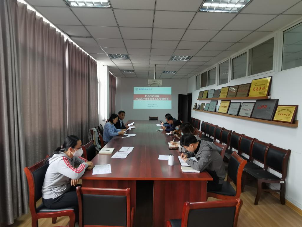 4月17日上午,信息技术学院在知行楼304会议室召开2020届毕业生就业工作专题会议。校党委委员、信息技术学院院长黄存东、院党总支副书记杨庆颖、院2020届毕业班班主任和就业辅导员参加了会议。会议由杨庆颖主持。