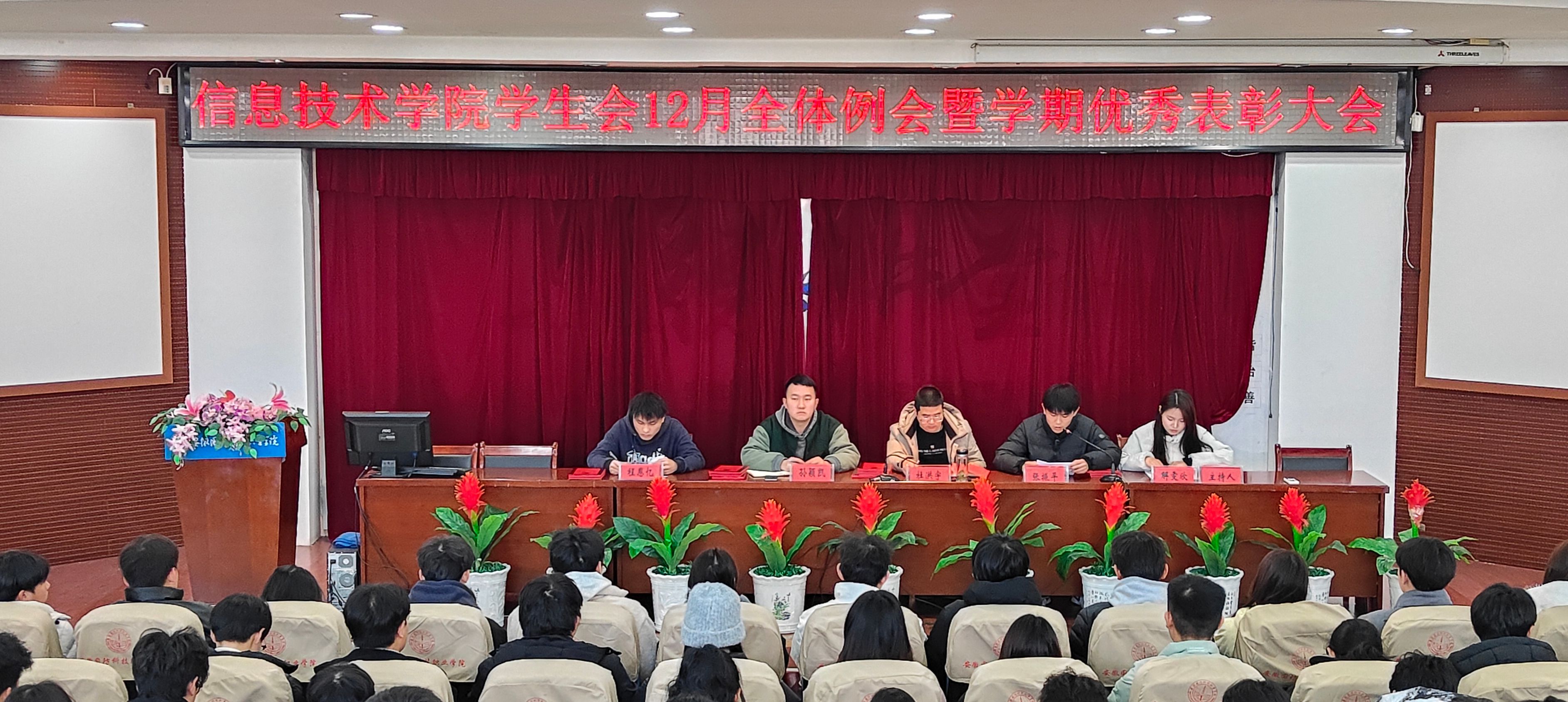 本网讯(信息技术学院 孙颖凯)为了总结信息技术学院学生会本学期各项工作经验,凝聚团队力量,激励广大成员奋勇争先,也为学院学生工作的持续推进与创新发展锚定方向。信息技术学院于12月20日中午在图书馆报告厅开展了学院学生会12月全体例会暨学期表彰大会。学院党总支副书记杜洪宇、团总支孙颖凯出席了会议,会议由学院学生会主席团解雯欣主持,全体学生会成员参加了会议。