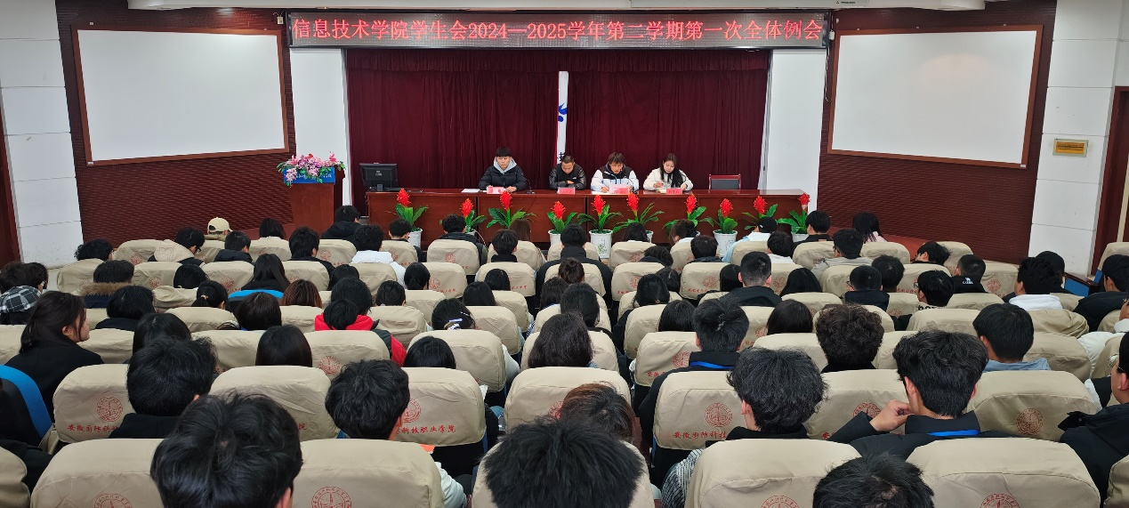 本网讯(学生通讯员 吴童周)为保障新学期学生会工作的有序开展,保证学生会工作的连续性与创新性。信息技术学院学生会于3月5日中午在图书馆报告厅召开2024-2025学年第二学期第一次全体例会。学生会全体成员参加此次会议。主席团成员张振平主持会议。