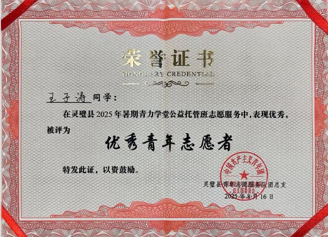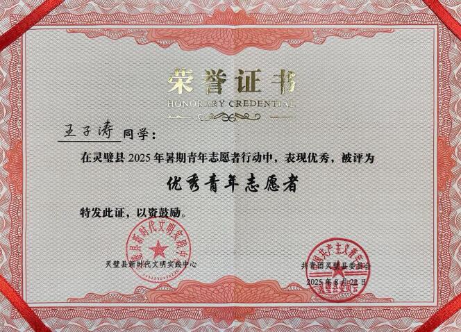 本网讯(信息技术学院 孙颖凯)为深入学习贯彻习近平新时代中国特色社会主义思想,积极落实“时代新人铸魂工程”,引导广大学生在社会实践中厚植家国情怀、增长知识才干,2025年7月至8月,信息技术学院团总支精心组织了“三下乡”大学生暑期社会实践系列活动。其间,2024级人工智能技术应用专业1班班长兼副团支书王子涛凭借突出表现,荣获宿州市灵璧县及灵璧县志愿服务总队联合授予的2025年大学生暑期社会实践“优秀青年志愿者”称号。