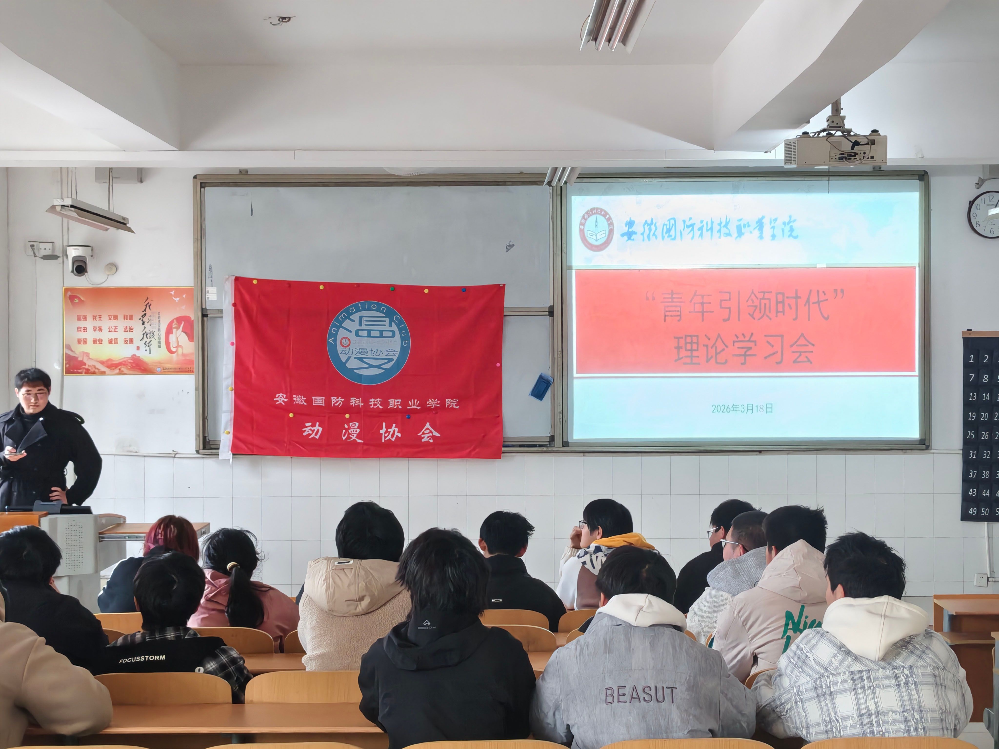 本网讯(学生通讯员 胡冬诚)为强化青年学生思想引领,厚植家国情怀,引导青年学子在实践中践行使命担当,3月18日下午,动漫协会在教室举办“青年引领时代”主题理论学习会。活动由协会文宣部负责人主持,协会全体成员参与其中。