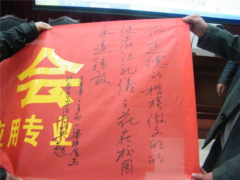 本次活动以“校园文明自我行”为主题,目的在于倡导全系乃至全院学生从我做起、从身边的小事做起,以实际行动树立当代大学生文明健康形象。系党总支书记梁继会应邀作开幕致辞,并对本次活动的意义给予了高度评价和积极肯定,他指出:追古溯今,中国一直是礼仪之邦,文明礼仪不仅是一国软实力的体现,更是展现民族精神与文化的窗口,当代的大学生更应该注重自身素质的培养,讲文明、懂礼仪、树新风,从身边的点滴做起,修身、成人、成才。随后,学生代表上台宣读了“校园文明自我行”倡议书,呼吁同学们从一言一行做起,一起筑造文明、友爱的和谐校园。活动中还展示了由本专业学生设计的文明标语宣传牌和文明标语集锦视频,并向全系发出征集文明标语、做文明有心人的倡议。开幕式在与会老师的题词和同学们的签名活动中顺利结束。
