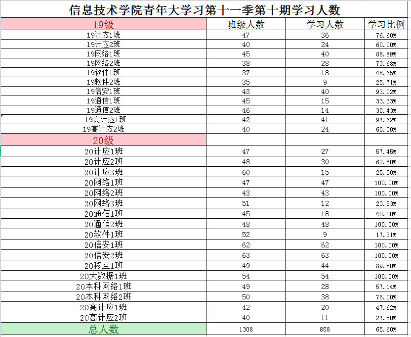 根据《2021年学院共青团工作计划》(校团〔2021〕5号)及《信息技术学院关于开展 2020—2021 学年 第二学期班级主题团日活动的通知》(校信息学院团总支函〔2021〕1 号)文件精神,信息技术学院团总支积极组织各班级开展“青年大学习”网上主题团课的学习。现将第十一季第十期各班级学习情况进行公开公示,欢迎大家监督(监督电话:0564-3384332),具体学习情况明细如下: