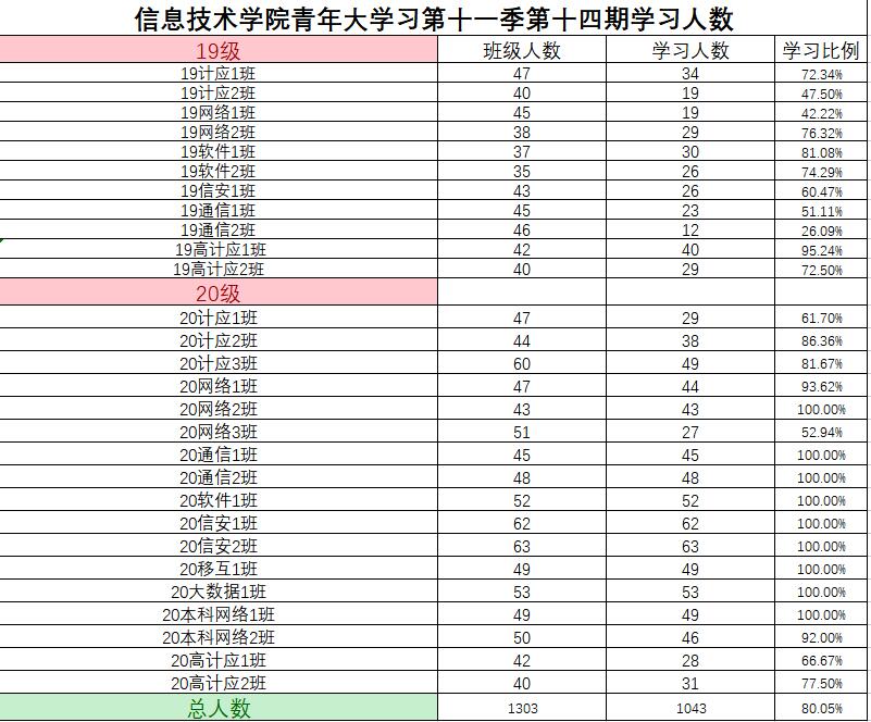 根据《2021年学院共青团工作计划》(校团〔2021〕5号)及《信息技术学院关于开展 2020—2021 学年 第二学期班级主题团日活动的通知》(校信息学院团总支函〔2021〕1 号)文件精神,信息技术学院团总支积极组织各班级开展“青年大学习”网上主题团课的学习。现将第十一季第四期各班级学习情况进行公开公示,欢迎大家监督(监督电话:0564-3384332),具体学习情况明细如下: