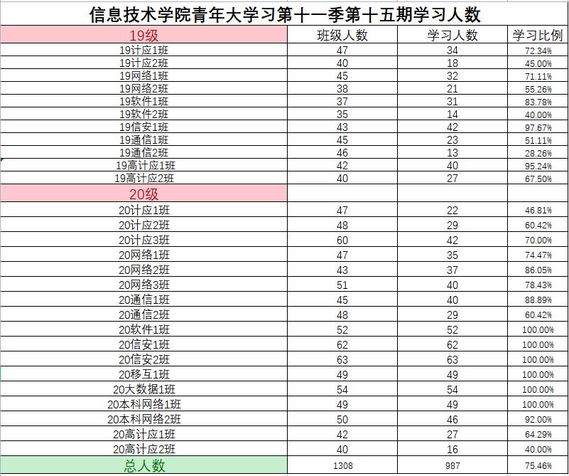根据《2021年学院共青团工作计划》(校团〔2021〕5号)及《信息技术学院关于开展 2020—2021 学年 第二学期班级主题团日活动的通知》(校信息学院团总支函〔2021〕1 号)文件精神,信息技术学院团总支积极组织各班级开展“青年大学习”网上主题团课的学习。现将第十一季第十五期各班级学习情况进行公开公示,欢迎大家监督(监督电话:0564-3384332),具体学习情况明细如下: