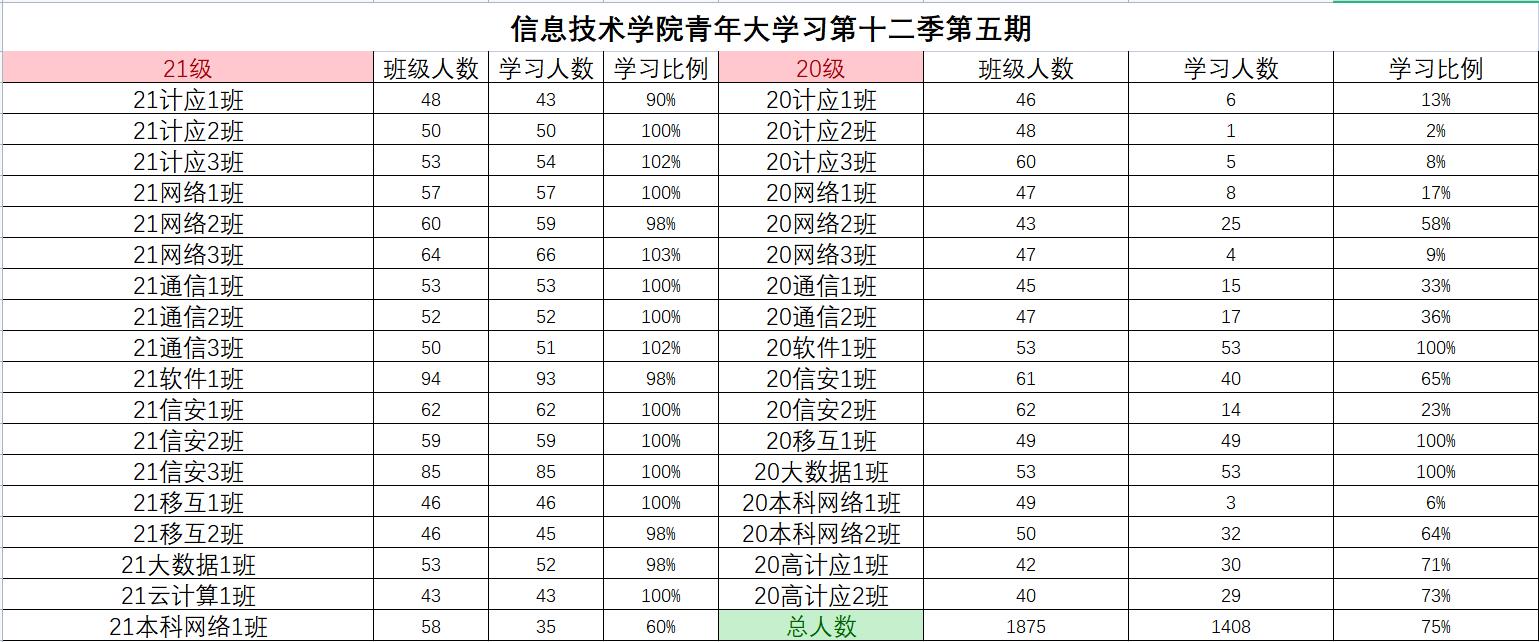根据《2021年学院共青团工作计划》(校团〔2021〕5号)及《信息技术学院关于开展 2021—2022 学年 第一学期班级主题团日活动的通知》(校信息学院团总支函〔2021〕1 号)文件精神,信息技术学院团总支积极组织各班级开展“青年大学习”网上主题团课的学习。现将第十二季第五期各班级学习情况进行公开公示,欢迎大家监督(监督电话:0564-3384332),具体学习情况明细如下: