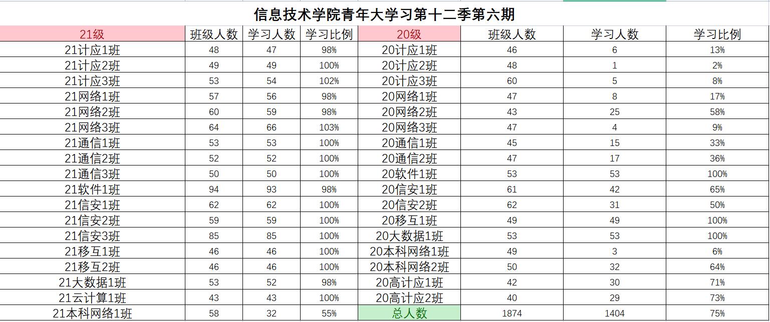 根据《2021年学院共青团工作计划》(校团〔2021〕5号)及《信息技术学院关于开展 2021—2022 学年 第一学期班级主题团日活动的通知》(校信息学院团总支函〔2021〕1 号)文件精神,信息技术学院团总支积极组织各班级开展“青年大学习”网上主题团课的学习。现将第十二季第六期各班级学习情况进行公开公示,欢迎大家监督(监督电话:0564-3384332),具体学习情况明细如下: