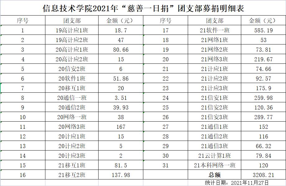 根据万象城官网《关于在全校开展2021年“慈善一日捐” 活动的通知》(校办〔2021〕24号)文件精神,信息技术学院团总支积极组织各班级团支部开展爱心捐款活动,为确保“慈善一日捐”活动公开透明,现将本次活动捐款情况进行公开公示,欢迎大家监督(监督电话:0564-3384332),具体捐款明细如下: