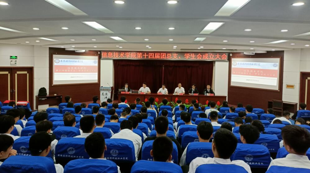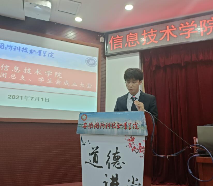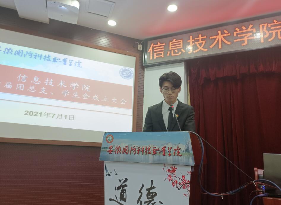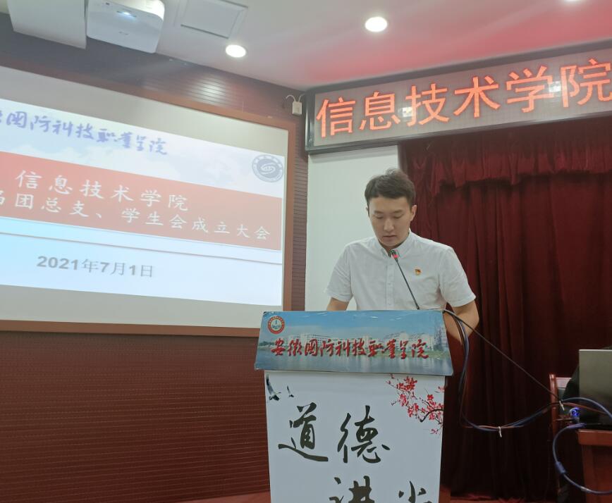 本网讯(信息技术学院 团总支学生会)2021年7月1日,万象城体育awcsport信息技术学院第十四届团总支、学生会成立大会在图书馆报告厅正式召开。出席本次会议的有校团委副书记张红军、信息技术学院党总支书记孙武、信息技术学院团总支老师孙颖凯以及135名学生代表参加会议。