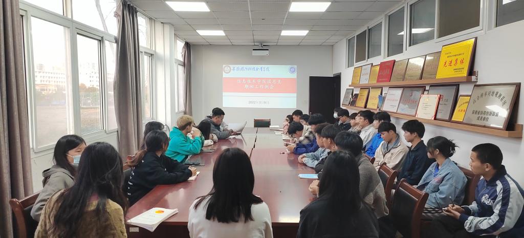 本网讯(信息技术学院 孙颖凯)为切实执行校、院共青团年度工作重点,不断提高团的政治感召力、组织力、服务力和服务大局的贡献度,信息技术学院团总支于3月9日下午5点45分召开学院团总支期初工作例会,学院团总支书记孙颖凯参加并主持会议,学院20、21级各班级团支书参加了会议。