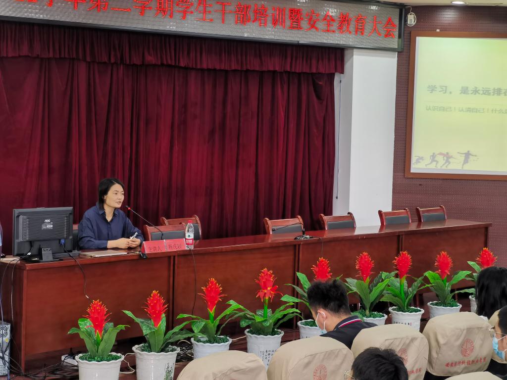 本网讯 为增强院学生干部的大局意识、服务意识、责任意识,增强学生干部的整体素质,以便更好地服务于学院师生,同时进一步加强学院学生安全教育工作,强化和引导学生自觉遵守校纪校规。5月21日上午,信息技术学院在图书馆报告厅召开了信息技术学院2021-2022学年第二学期学生干部培训暨安全教育大会。学院党总支副书记杨庆颖为学院学生干部做培训报告,会议由学院团总支书记孙颖凯主持。