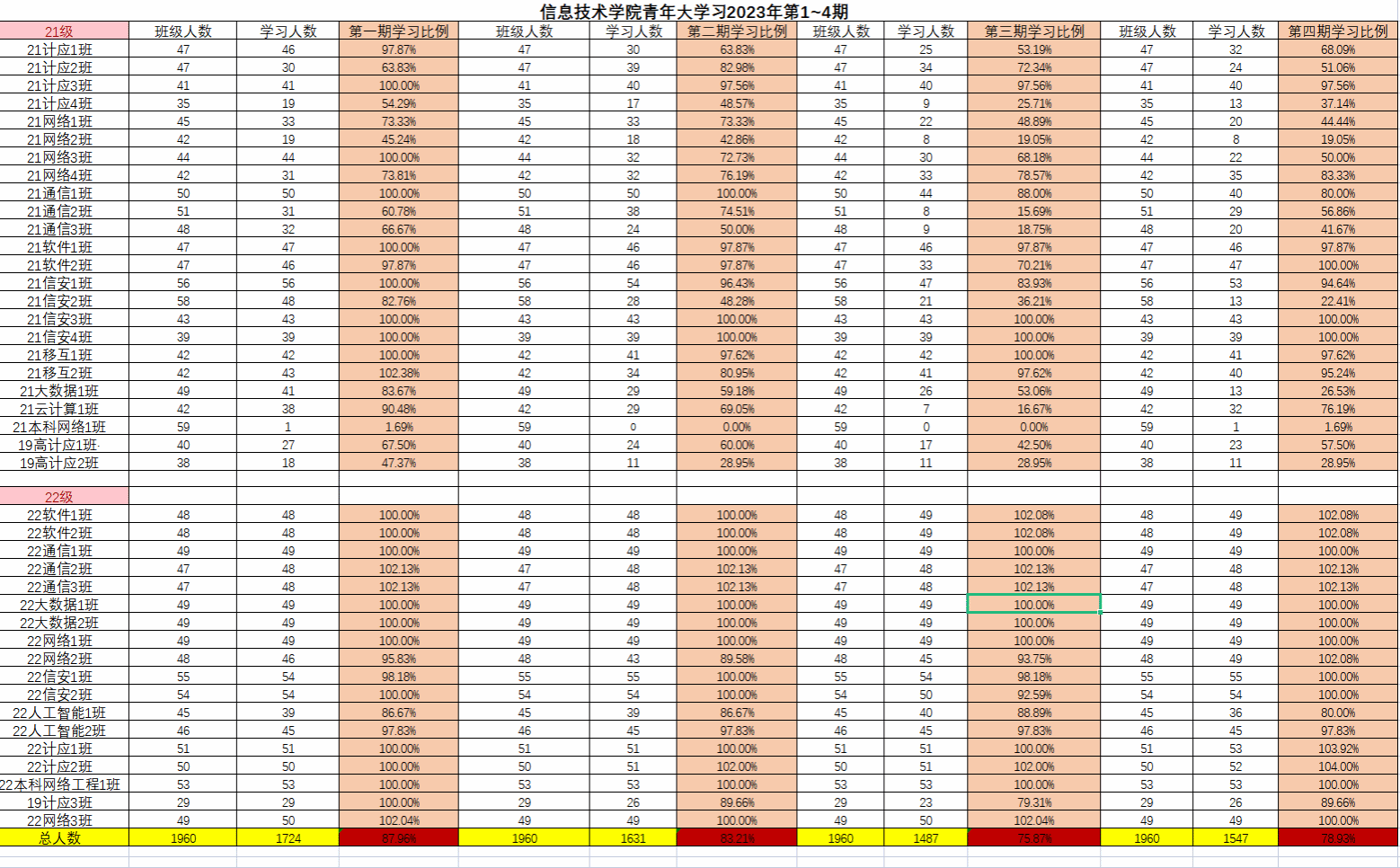 根据信息技术学院《关于开展2022-2023学年第二学期班级主题团日活动的通知》(校信息学院团总支函〔2023〕2 号)文件精神,信息技术学院团总支积极组织各班级开展“青年大学习”网上主题团课的学习。现将2023年第一至四期各班级学习情况进行公开公示,欢迎大家监督(监督电话:0564-3384332),具体学习情况明细如下: