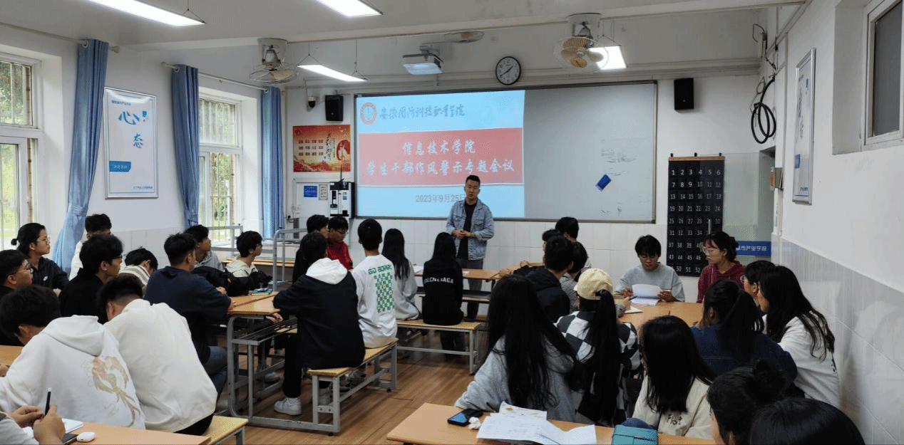 本网讯 (信息技术学院 学生会)为进一步加强学生干部队伍建设,提升学生干部队伍思想政治觉悟,牢记服务宗旨,强化服务意识、纪律意识,不断改进工作作风,充分发挥学生干部的榜样引领作用,信息技术学院于9月25日中午在1教105教室开展了新学期学生干部作风警示教育专题会议。信息技术学院团总支书记孙颖凯主持会议,院学生会全体成员及2022级部分学生干部参加了会议。
