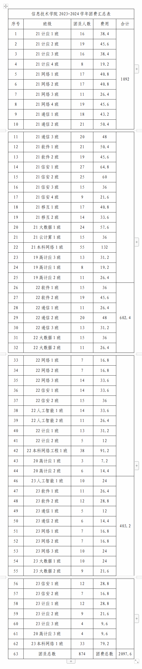 根据《中国共产主义青年团章程》及《共青团中央关于印发<关于中国共产主义青年团团费收缴、使用和管理的规定>的通知》文件精神,信息技术学院团总支于2023年11月完成了2023-2024学年各班级团费收缴工作,现将团费收缴情况进行公示,欢迎大家监督(监督电话:0564-3384332)。如下情况如下: