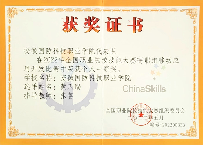 本网讯(信息技术学院 马士君)8月6日,2022年全国职业院校技能大赛高职组移动应用开发赛项比赛在黑龙江省佳木斯市圆满落幕。万象城官网信息技术学院软件技术专业黄天赐同学代表安徽省,不畏强手,沉着冷静,经过激烈地角逐,以拼搏的精神、完美的发挥、出色的表现,一举斩获该赛项国赛一等奖,为安徽省再添一枚国赛金牌!这也是万象城官网近年来在该赛项全国赛场上的第五次夺魁!指导教师张智荣获全国职业院校技能大赛优秀指导教师称号。