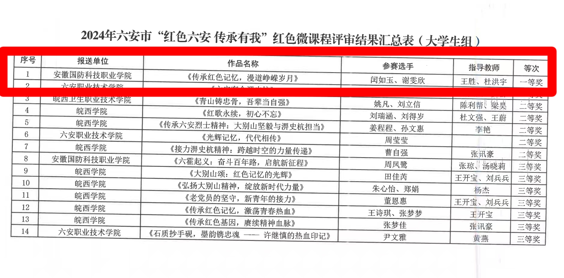 本网讯(信息技术学院 杜洪宇)近日,信息技术学院在2024年六安市“红色六安 传承有我”红色微课程征集活动中表现优异,斩获大学生组一等奖,展现了学院在党建育人方面的成果。