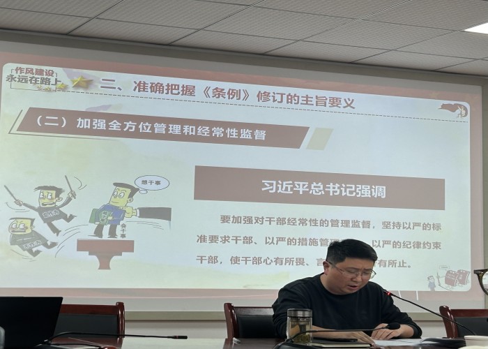 党课上,王胜结合高校教育教学工作实际,从深刻认识修订《条例》的重要意义,准确把握《条例》修订的主旨要义,坚决贯彻执行《条例》以严明的纪律推进教育教学各项工作等方面对《条例》进行深入解读。并通过具体警示教育案例,深入浅出地阐述了《条例》中的各项规定,使党员干部对党的纪律要求有了更清晰、更深刻的认识。