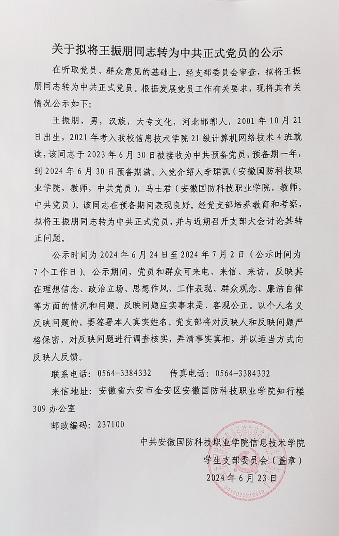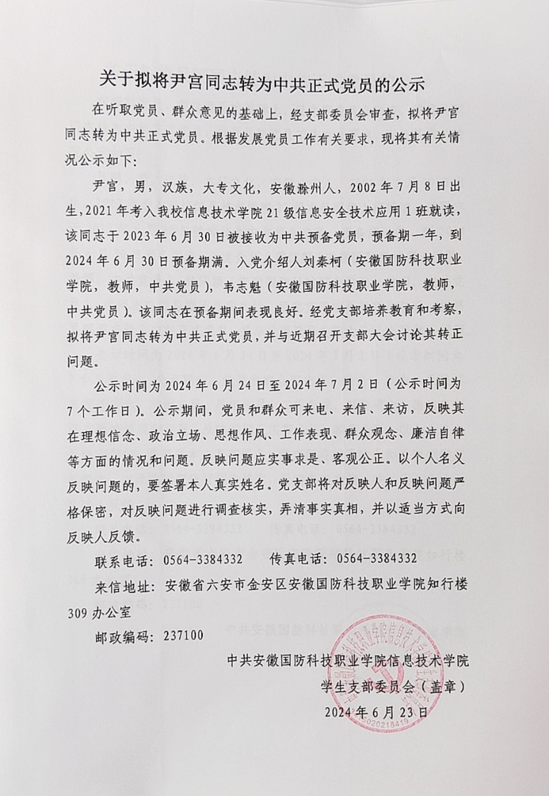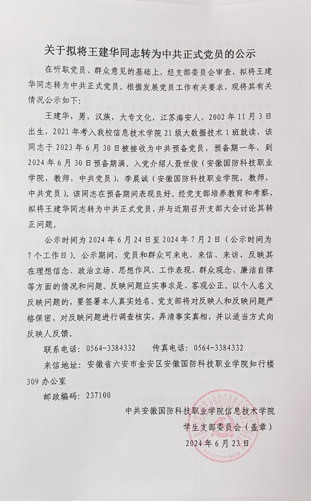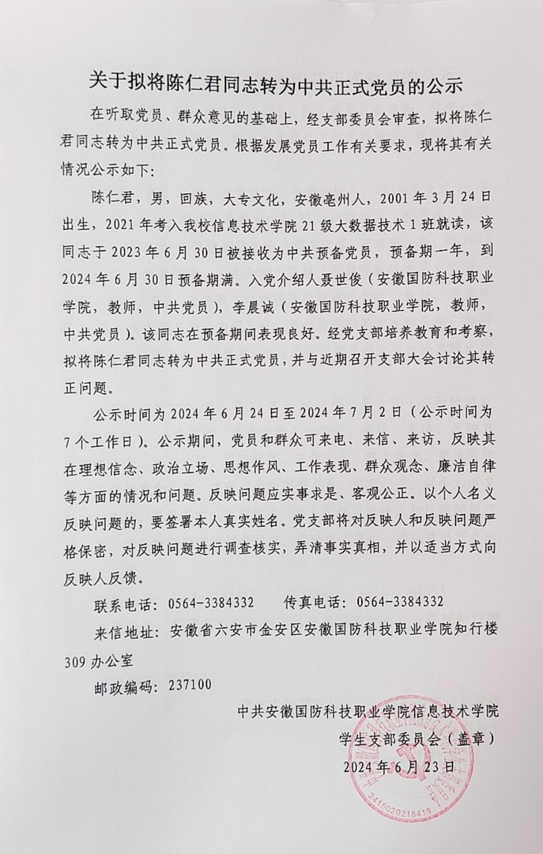 关于拟将陈仁君等14名同志转为中共正式党员的公示