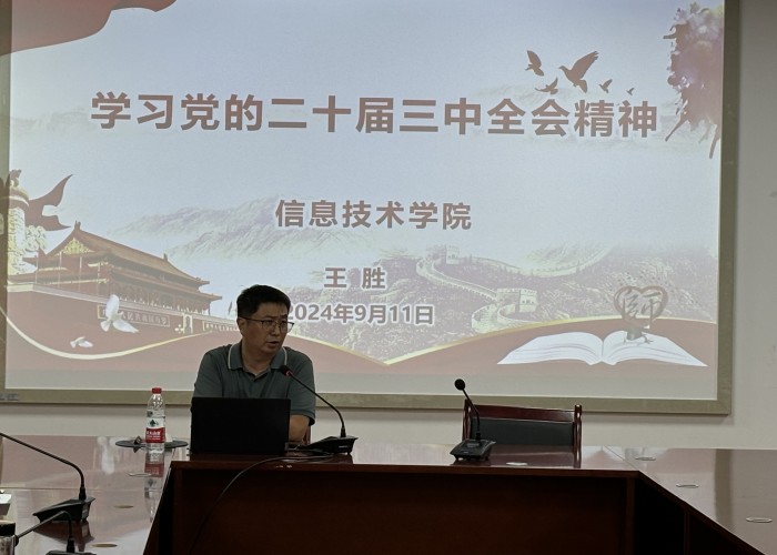 本网讯(信息技术学院 马士君)为深入学习贯彻落实党的二十届三中全会精神,推进学院教育教学工作高质量发展。9月11日下午,在秉心楼902会议室,学院党总支书记王胜为全体党员同志讲授题为《学习党的二十届三中全会精神》的专题党课。学院领导班子及全体教师党员、学生党员50余人参加了会议。