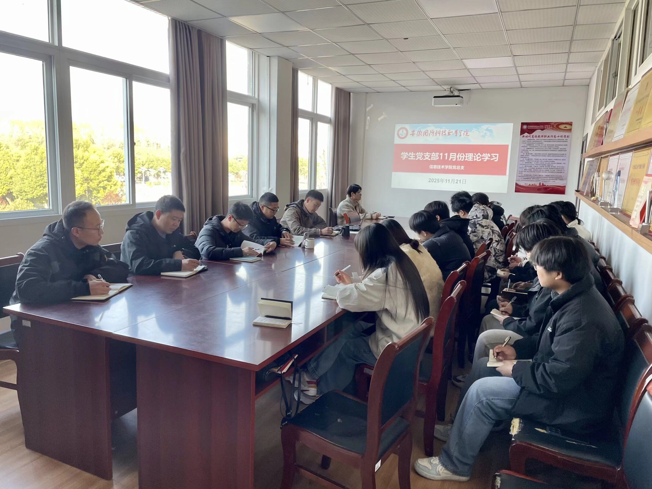 本网讯(学生通讯员 王俊)11月21日,信息技术学院学生党支部在知行楼304会议室召开11月份党员大会。会议由支部书记杜洪宇主持,全体在校师生党员参会,校外实习党员线上同步参会。