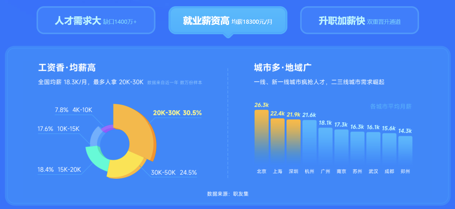 从数据团队调查问卷和数据分析中发现,市场对数据人才的需求仍然呈现明显的上升趋势;数据分析岗、系统开发类、数据管理类岗位人才供不应求。大数据技术专业的毕业生在就业市场上具有广阔的前景,主要就业方向包括: