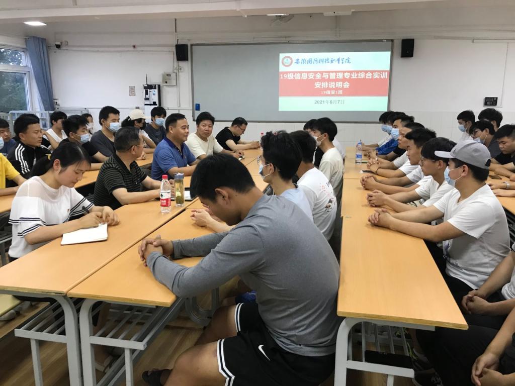 本网讯(信息技术学院 马士君)6月7日晚7:00,信息技术学院在一教212教室召开2019级信息安全与管理专业综合实训安排说明座谈会。校党委委员、信息技术学院院长黄存东、学院党总支书记孙武、副书记杨庆颖出席会议,出席会议的还有伟创聚赢安徽区总经理毛胜红、校区负责人王世军,19信安1班的班主任及全体同学参加了座谈会。会议由杨庆颖主持。为了更好的融入同学们中,拉近与同学们的距离,学院领导和企业人员主动坐到同学们的中间,师生之间亲密无间畅所欲言。