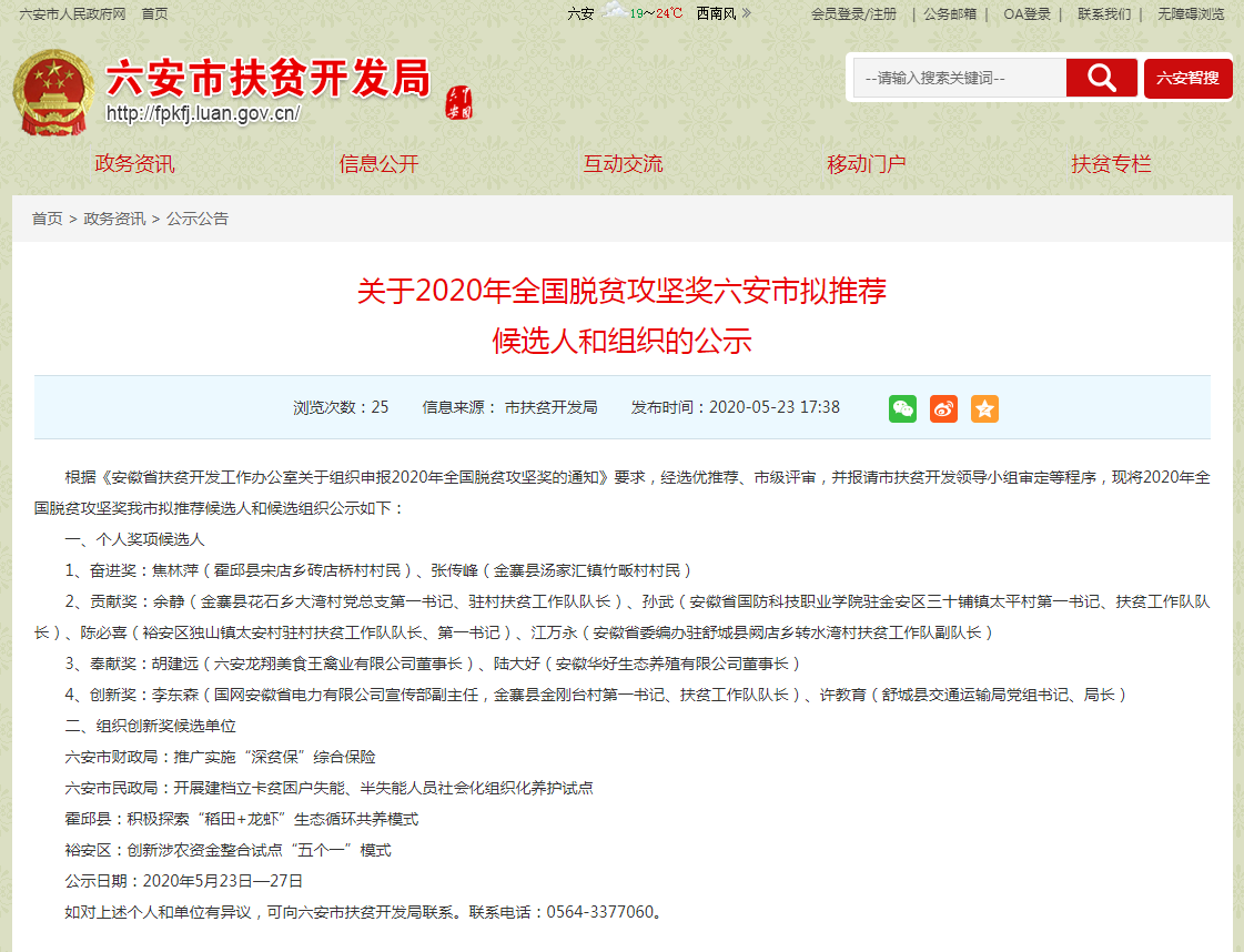 本网讯 近日,六安市扶贫开发局网站和六安市人民政府微信公众号发布关于2020年全国脱贫攻坚奖六安市拟推荐候选人和组织的公示,万象城体育awcsport驻金安区三十铺镇太平村第一书记、扶贫工作队队长孙武荣获2020年全国脱贫攻坚贡献奖六安市拟推荐候选人。