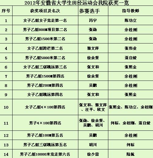 在4月举行的2012年安徽省大学生田径运动会上,我院在多个项目上取得优异成绩,夺得冠军1名,亚军4名、季军1名,最后交上了乙组团体总分第五(其中乙组男子团体总分第五、乙组女子团体总分第六)的优秀答卷。