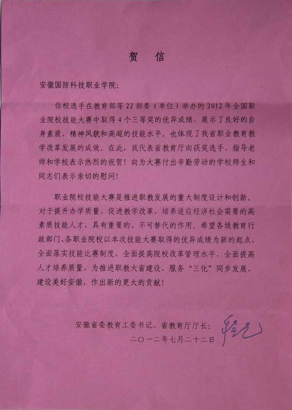 4月,安徽省职业院校技能大赛在合肥、芜湖等地同时举行,我院代表队不畏强手,沉着应战,在参加的13个项目中共获11个奖项,其中一等奖2个、二等奖2个、三等奖7个,其中自动化生产线安装与调试、信息安全管理与评估两个项目获一等奖;产品创新设计与快速成型、计算机网络应用两个项目获二等奖,报关、产品创新设计与快速成型、电子产品设计及制作、机器人技术应用、汽车营销、物联网、现代物流储存与配送作业优化实施7个项目获三等奖。同时被省教育厅、省财政厅、省人社厅和省经济和信息化委员会确定为2012年全省高职高专院校职业技能大赛“优秀组织奖”获奖单位。
