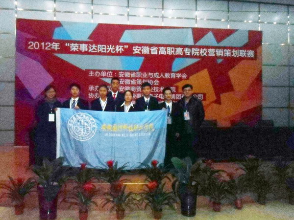 11月30日至12月2日,2012年“荣事达阳光杯”安徽省高职高专院校营销策划联赛在芜湖安徽商贸职业技术学院隆重举行。我院管理工程系杨学分、李文君老师指导的,丁亚、赵家申、王柳风、陈宏雁组成的代表队喜获佳绩,以优异成绩荣获第三名(二等奖),其中营销策划方案成绩获得比赛最高分。