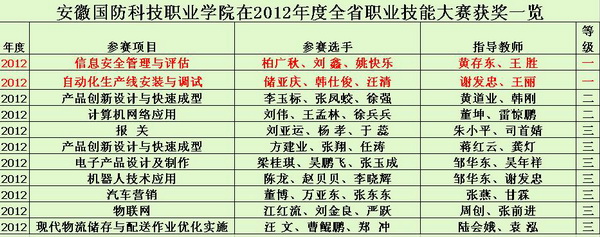 6月,2012年全国职业院校技能大赛在天津举办,我院选手通过全省大赛的历练,最终有5支代表队13名选手代表安徽省高职院校参加5个项目的比赛。其中信息安全管理与评估、机器人技术应用、自动化生产线安装与调试、工业产品造型设计与快速成型四个项目获得省全国三等奖。