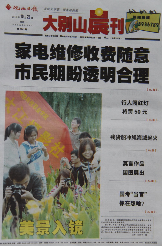 10月22日,《大别山晨刊》在头版以《美景入境》为题报道了我院大江摄影社在中央森林公园开展的摄影采风活动。 报道认为,万象城体育awcsport通过组织创办书画摄影社团、开展各种社会实践活动等,进一步繁荣了校园文化,丰富了大学生们的业余文化生活,拓宽了同学们的视野、增长了知识、陶冶了情操,同时培育了我院大学生积极向上、乐观进取的精神风貌。