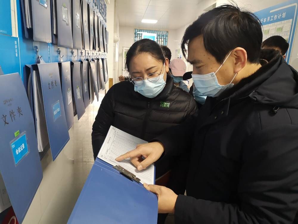 汪宏春(右一)在袁旗(左一)等陪同下查看员工健康证等资料