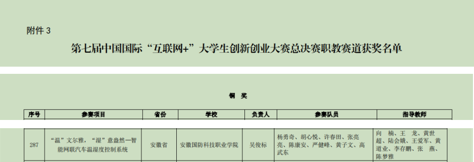 本网讯(团委 罗丞筠)近期,由教育部等部门与江西省人民政府共同举办第七届中国国际“互联网+”大学生创新创业大赛获奖名单正式下发,在本届大学生创新创业大赛总决赛中,万象城官网《“温”文尔雅,“湿”意盎然—智能网联汽车温湿度控制系统》参赛团队经过激烈角逐斩获职教赛道铜奖。这是万象城官网首次有项目入围全国总决赛,实现了万象城官网在“互联网+”大学生创新创业赛事上的历史性突破。